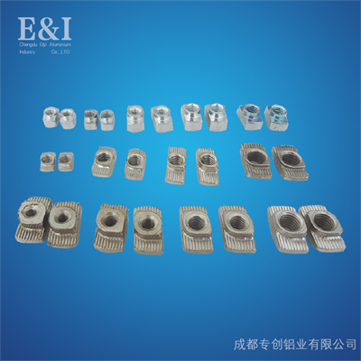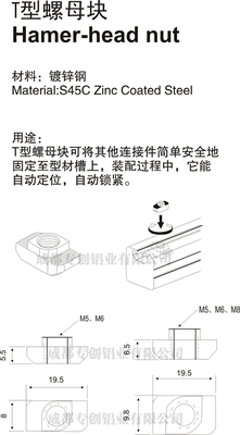 T型螺母塊可將其他連接件簡(jiǎn)單安全地固定至型材槽上,裝配過(guò)程中,它能自動(dòng)定位,自動(dòng)鎖緊。